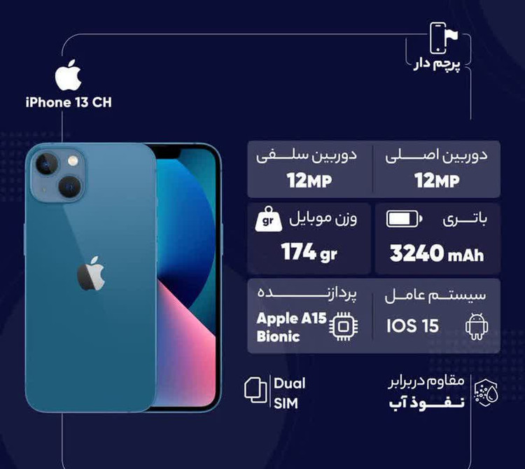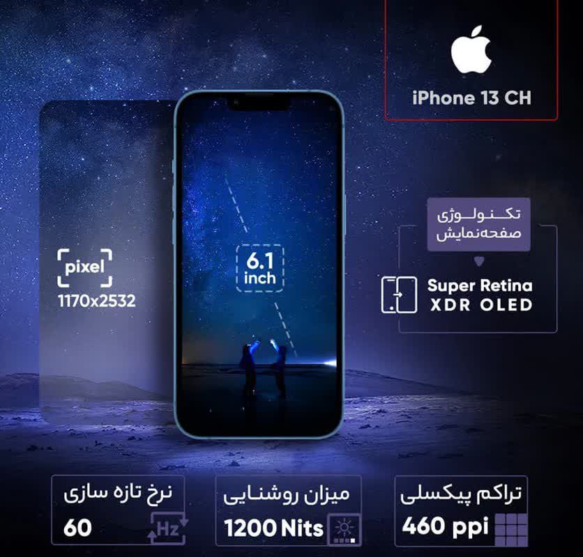سایر قابلیتها : شیشه سرامیکی مقاوم در برابر خراش، پوشش اولئوفوبیک / طیف وسیع رنگ / True-tone / Super Retina XDR OLED / HDR۱۰ / Dolby Vision